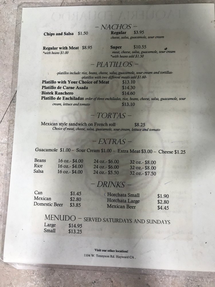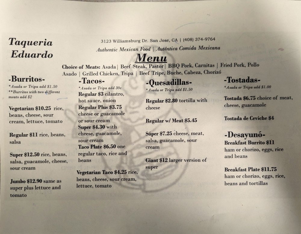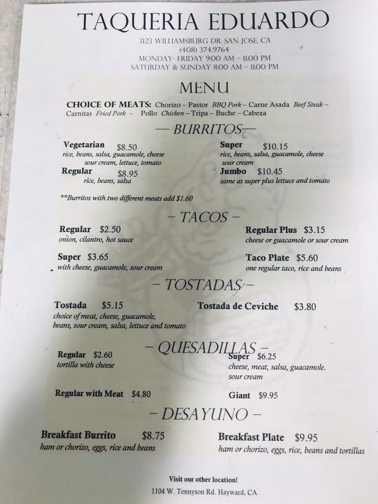 Taqueria Eduardo is a hidden gem in San Jose, offering authentic Mexican cuisine with a focus on quality and flavor. Located on Williamsburg Drive, this family-owned restaurant provides a welcoming atmosphere for families and groups. The menu features a variety of options, from breakfast burritos to flavorful burritos with customizable fillings. Customers rave about the generous portions and delicious flavors, with highlights including the veggie tacos, carne asada super burrito, and mouthwatering carnitas burrito. The friendly staff adds to the overall dining experience, making this taqueria a top choice for locals. With affordable prices and a menu that caters to both meat lovers and vegetarians, Taqueria Eduardo is a must-visit spot for those craving authentic Mexican dishes in the South Bay area.