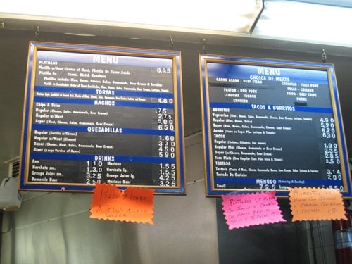 Platillos include: rice, Beans, cheese, salsa, guacamole, Sour cream & tortillas